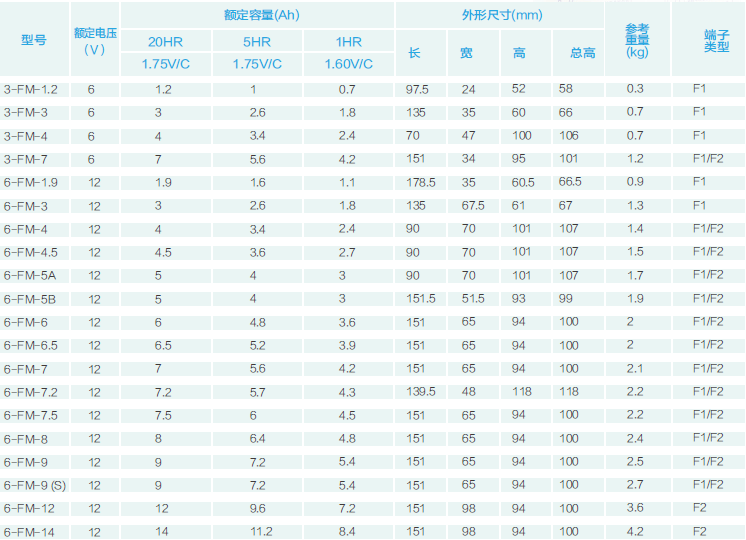 在20℃環(huán)境下,F(xiàn)M系列小型密封電池浮充壽命可達3~5年,F(xiàn)M固定型密封電池浮充壽命可達8~10年,F(xiàn)ML系列電池浮充壽命可達10年,F(xiàn)MH系列電池浮充壽命可達10年,GFM系列、太陽能深循環(huán)系列電池浮充壽命可達15年,GFMJ系列電池浮充壽命可達18年。